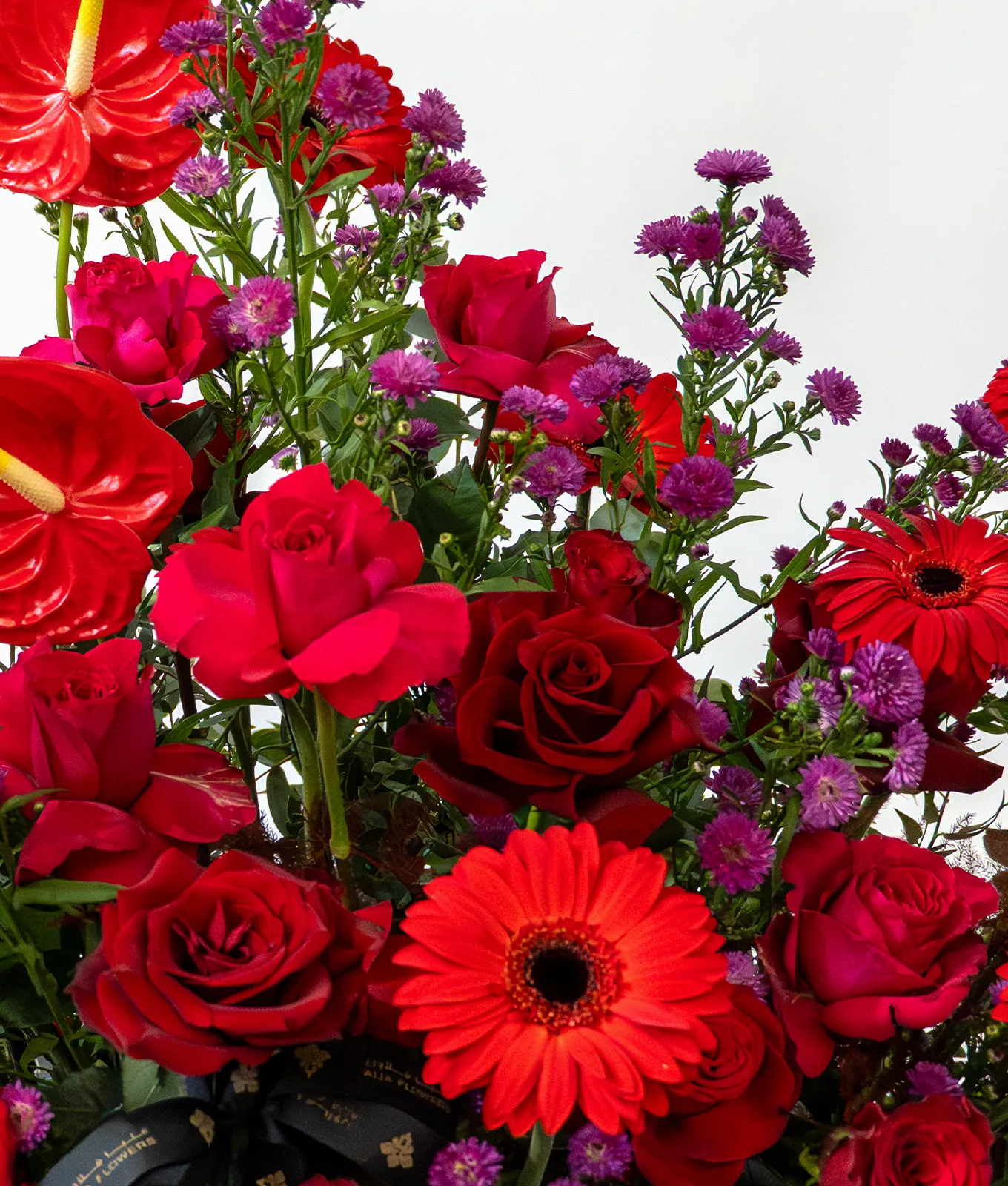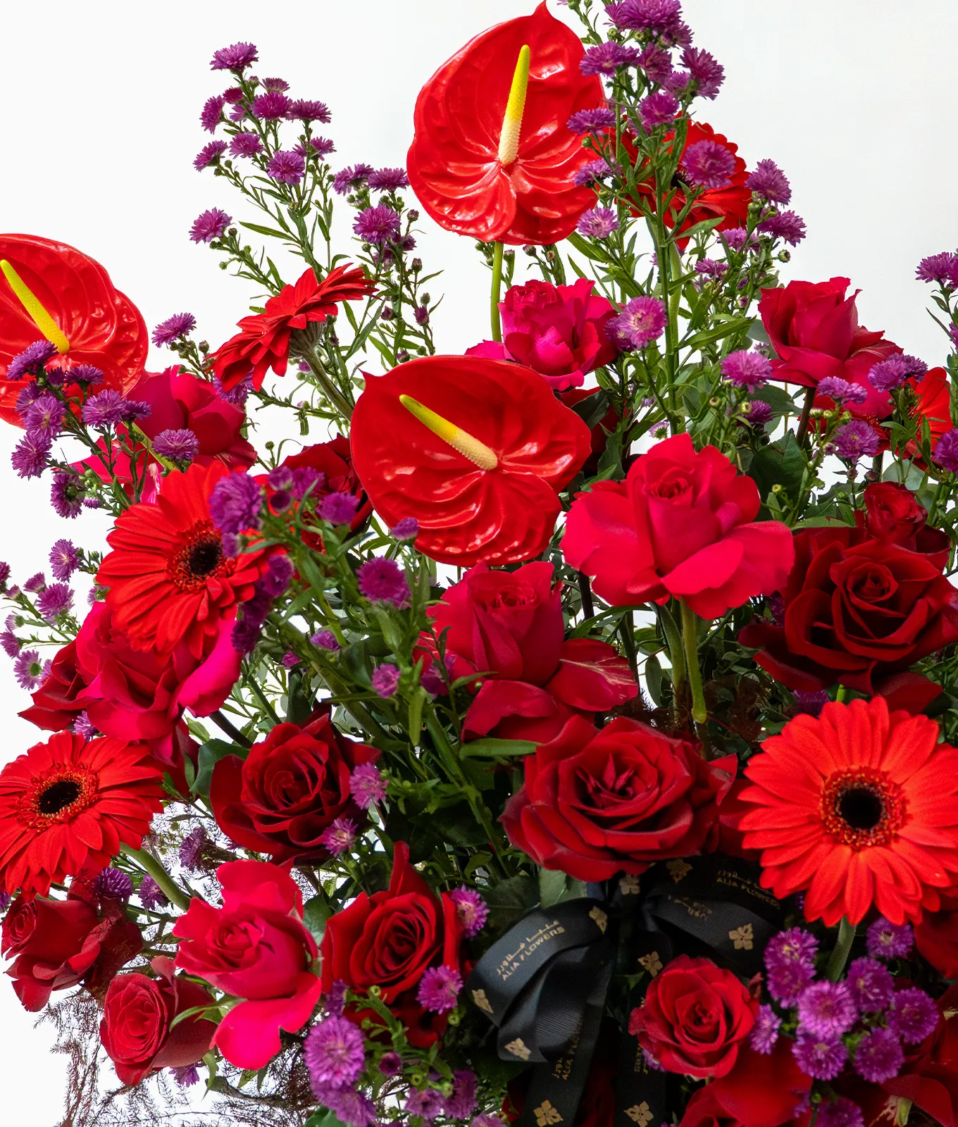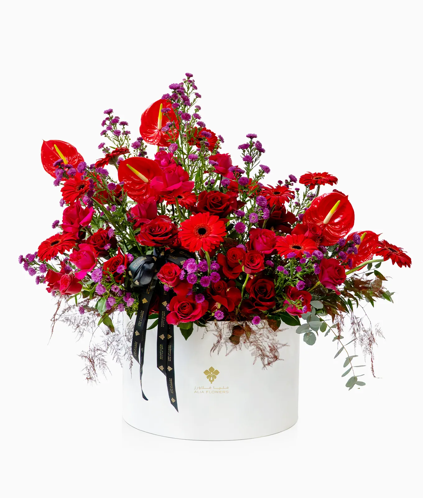 Set within a Signature White Alia Box, the arrangement is elevated by the glossy, architectural forms of Red Anthuriums and the vibrant contrast of Purple Aster stems. It stands as an opulent statement of luxury, perfect for creating an unforgettable impact.
