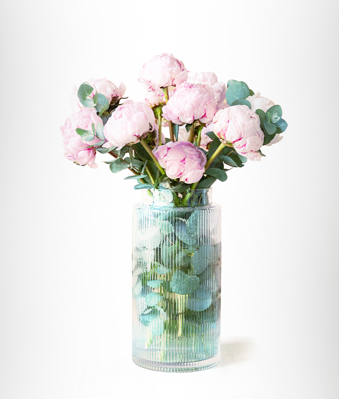 Soft pink peonies with lush eucalyptus leaves arranged in a glass vase.