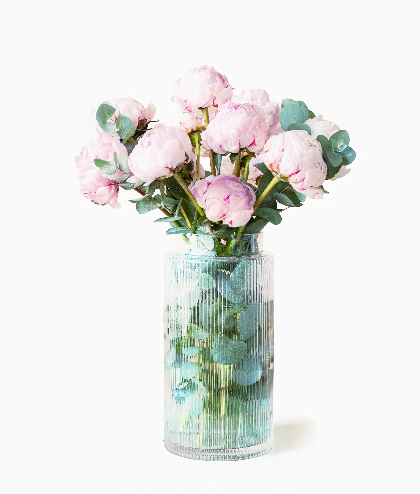 This arrangement features a mix of Pink Peonies, Eucalyptus Stems.