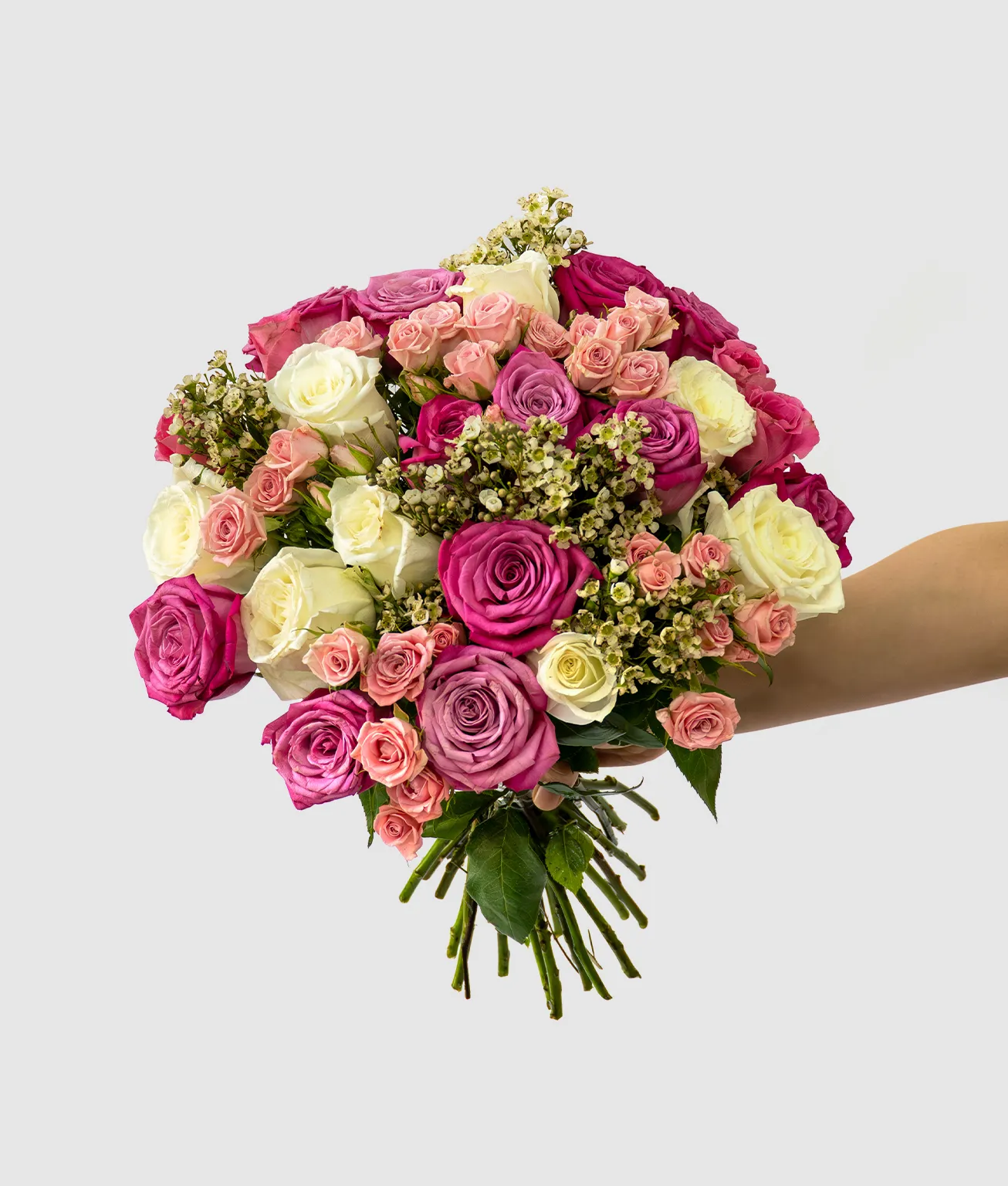 Sorbet Symphony is a delightful bouquet of purple, pink, and white roses. Accented with pink spray roses and white wax flowers, it radiates elegance, charm, and thoughtful beauty. Carefully arranged to highlight the vibrant mix of colors, it exudes sophistication and grace.