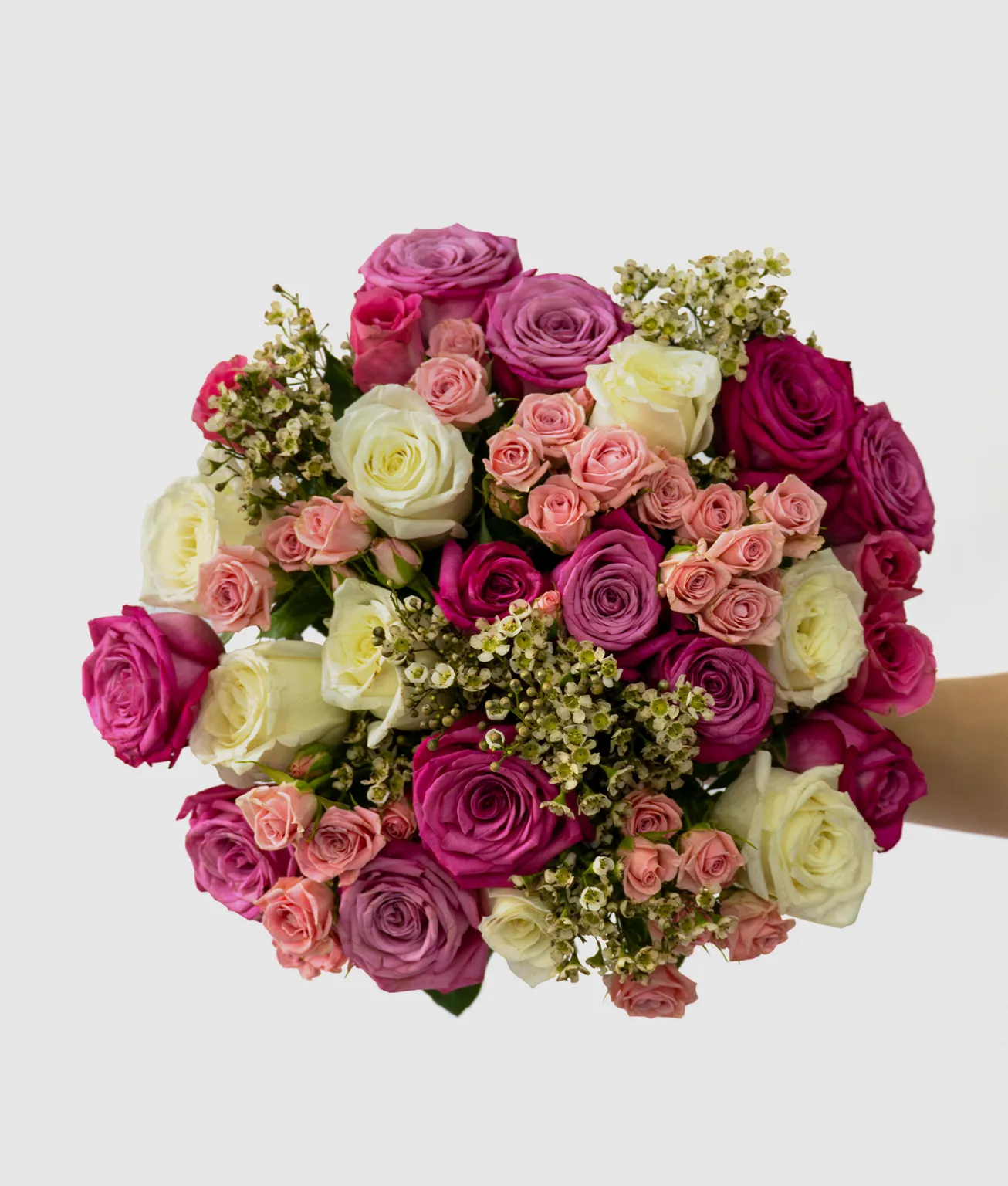 Sorbet Symphony is a delightful bouquet of purple, pink, and white roses. Accented with pink spray roses and white wax flowers, it radiates elegance, charm, and thoughtful beauty. Carefully arranged to highlight the vibrant mix of colors, it exudes sophistication and grace. The harmonious blend of purples, pinks, and whites creates a serene and uplifting presence. A perfect way to express love, admiration, and heartfelt appreciation to someone truly special.