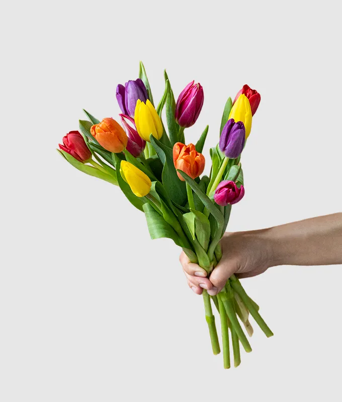 This bouquet features a mix of 12 Yellow, Pink, Purple, Red and Orange Tulips.