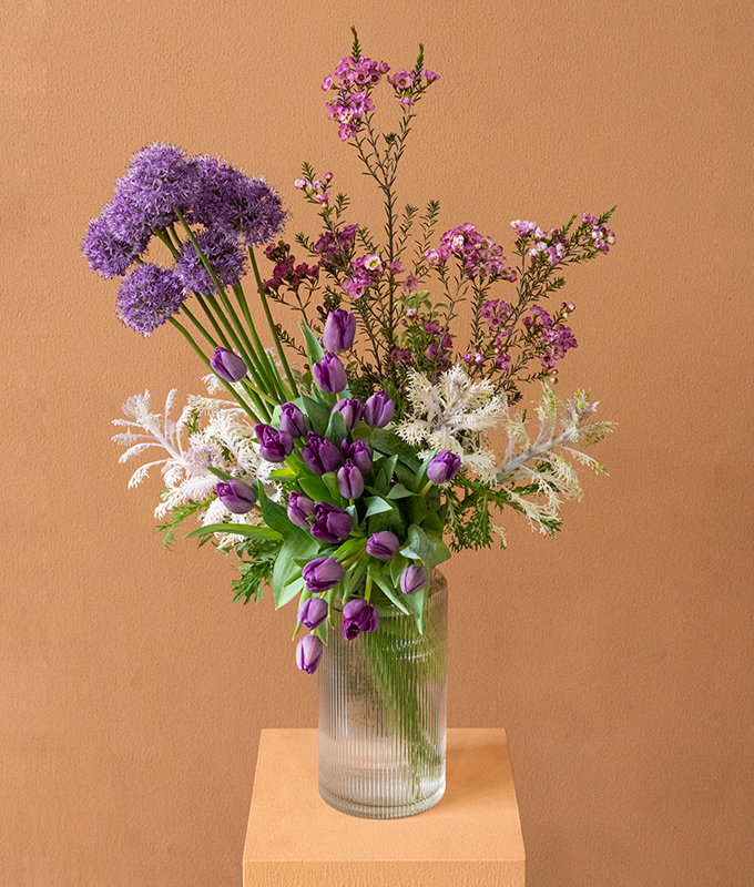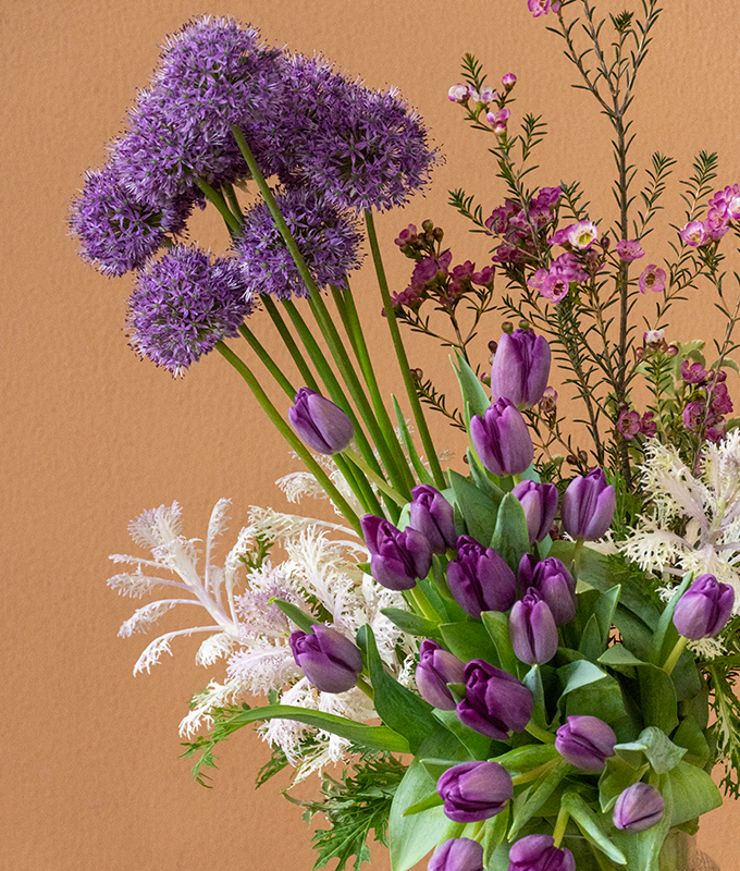This arrangement features a mix of Purple Tulips, Purple Brassica, Purple Waxflower, Purple Allium and Pittosporum.