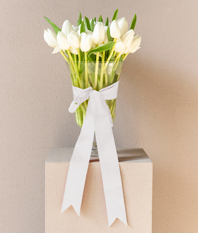 A stunning arrangement of 50 white tulips, accented with an elegant white ribbon. A sophisticated centerpiece for special celebrations.
