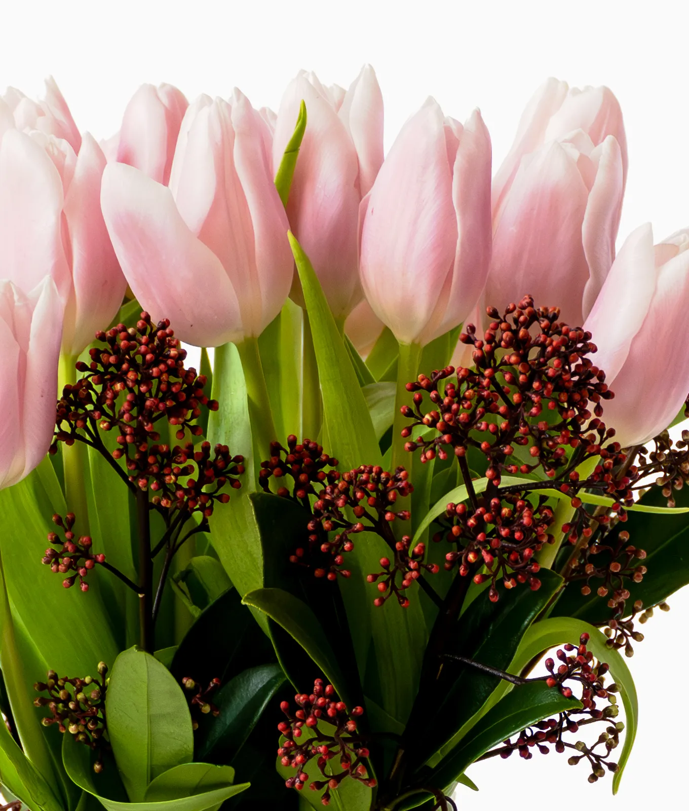 Tulip Treat is a vision of soft elegance, featuring Pink Tulips paired with textured Skimmia and a delicious Biscotto gift.