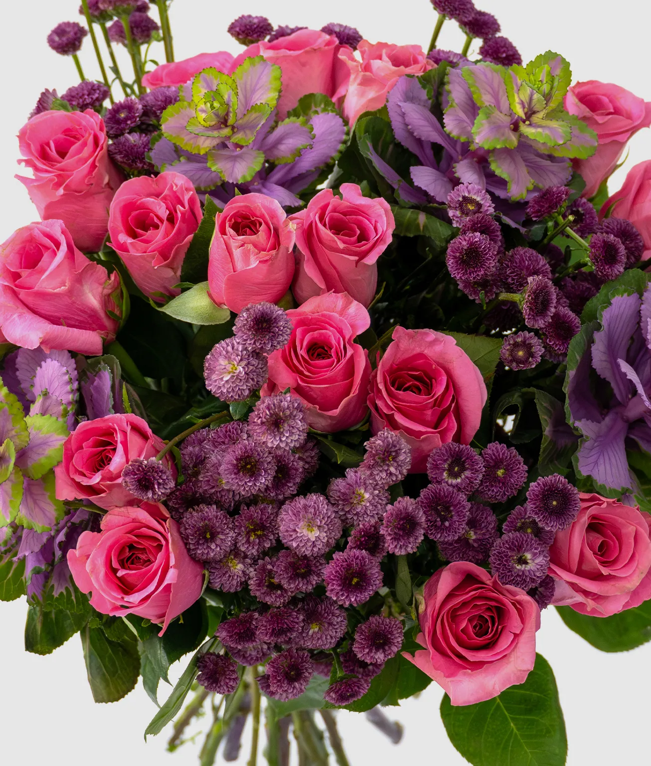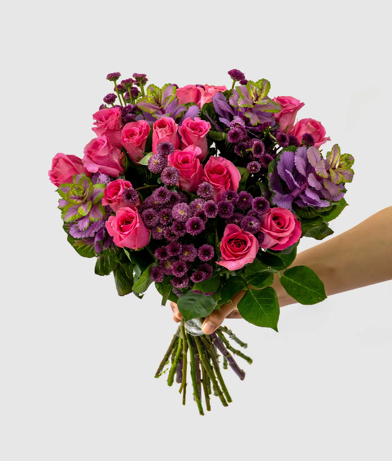 Twilight Bloom is a captivating bouquet of pink roses, purple brassica, and purple chrysanthemum buttons. Its rich colors exude elegance, charm, and heartfelt sentiment. Carefully arranged to highlight the contrasting hues, it radiates sophistication and natural beauty. The combination of soft pinks and deep purples creates a serene, uplifting presence. A perfect way to convey admiration, appreciation, and tender affection to a loved one.