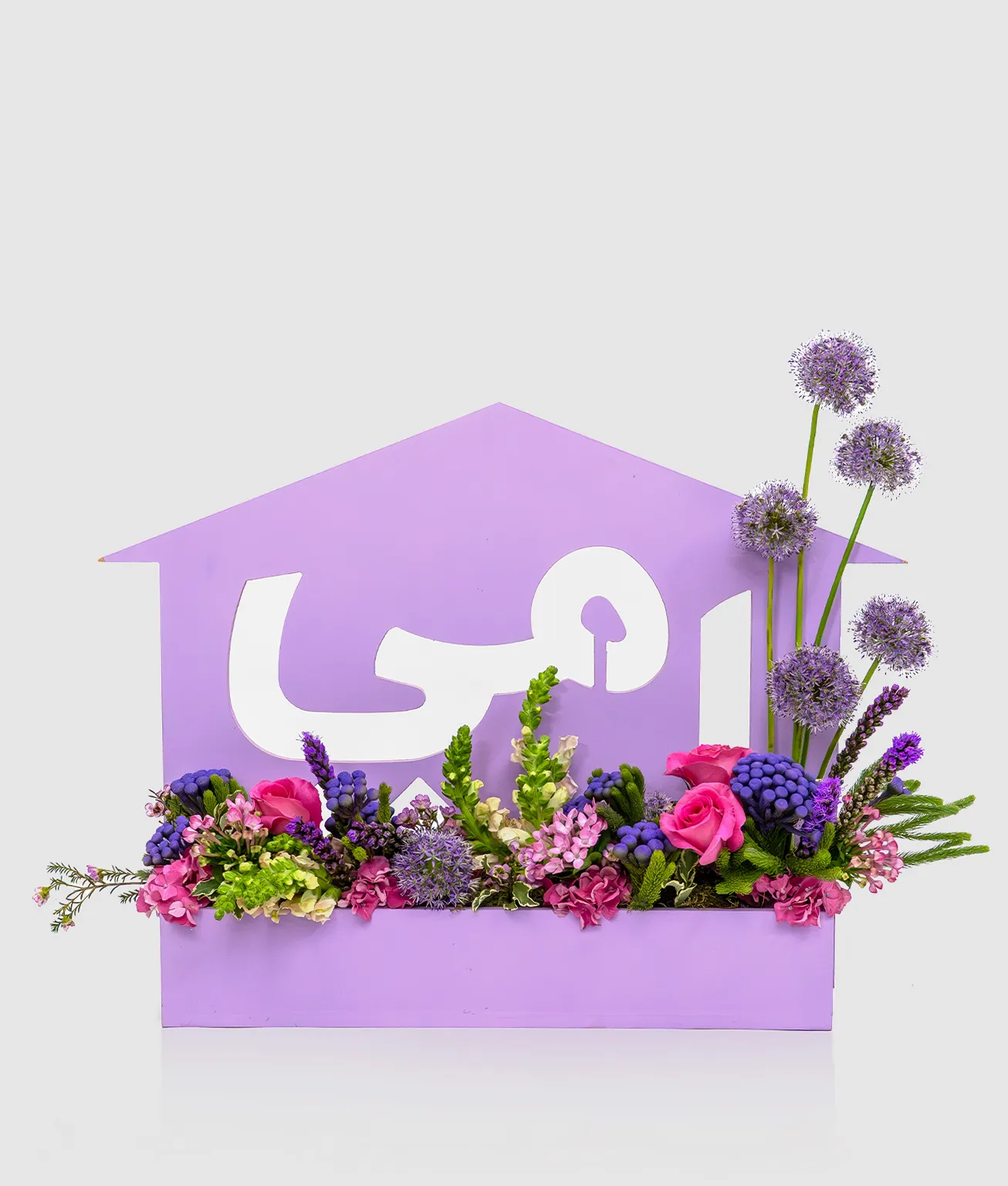 Ummi’s Affection is a charming flower arrangement of allium gladiator, liatris, purple brunia, and pink hydrangea. Enhanced with wax flowers and lush pittosporum, it radiates warmth and love, a perfect gift to honor a special mother. Carefully arranged in our signature Arabic Ummi crafted wooden box, it exudes elegance and charm. Its mix of purples and pinks creates a tender, uplifting presence. A beautiful way to show a mother she is cherished and truly special.