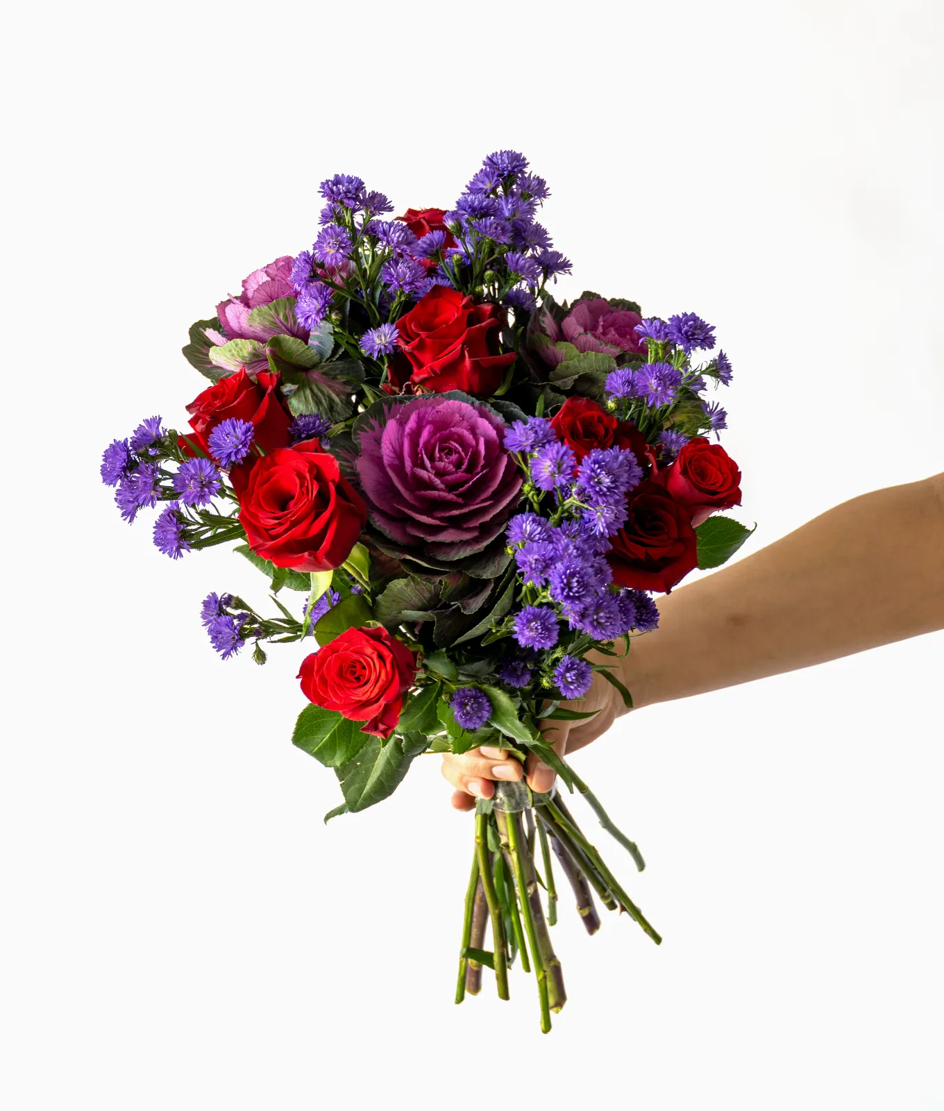 Velvet Promise is a captivating hand-tied bouquet that blends deep, regal tones with classic romance. This unique arrangement features Red Roses at its heart, surrounded by the architectural beauty of Purple Brassica.