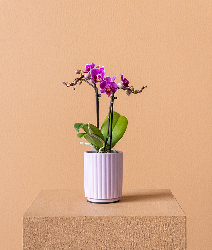 An enchanting orchid with rich purple blooms, the Phalaenopsis Multiflora adds a touch of mystery and charm. Planted in a soft pastel pink ribbed ceramic pot, this arrangement brings an elegant contrast, making it a captivating accent for any décor.