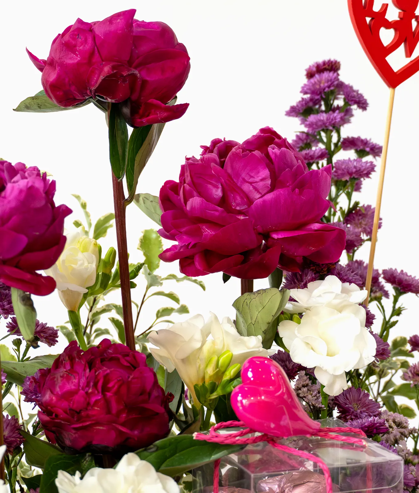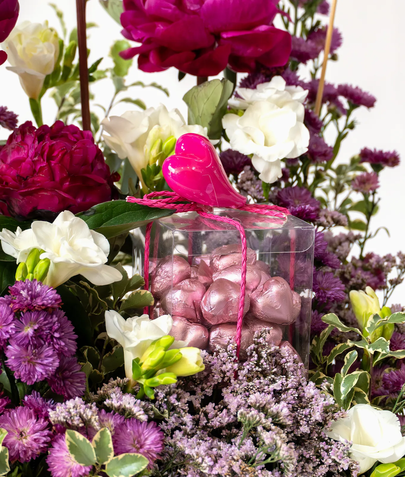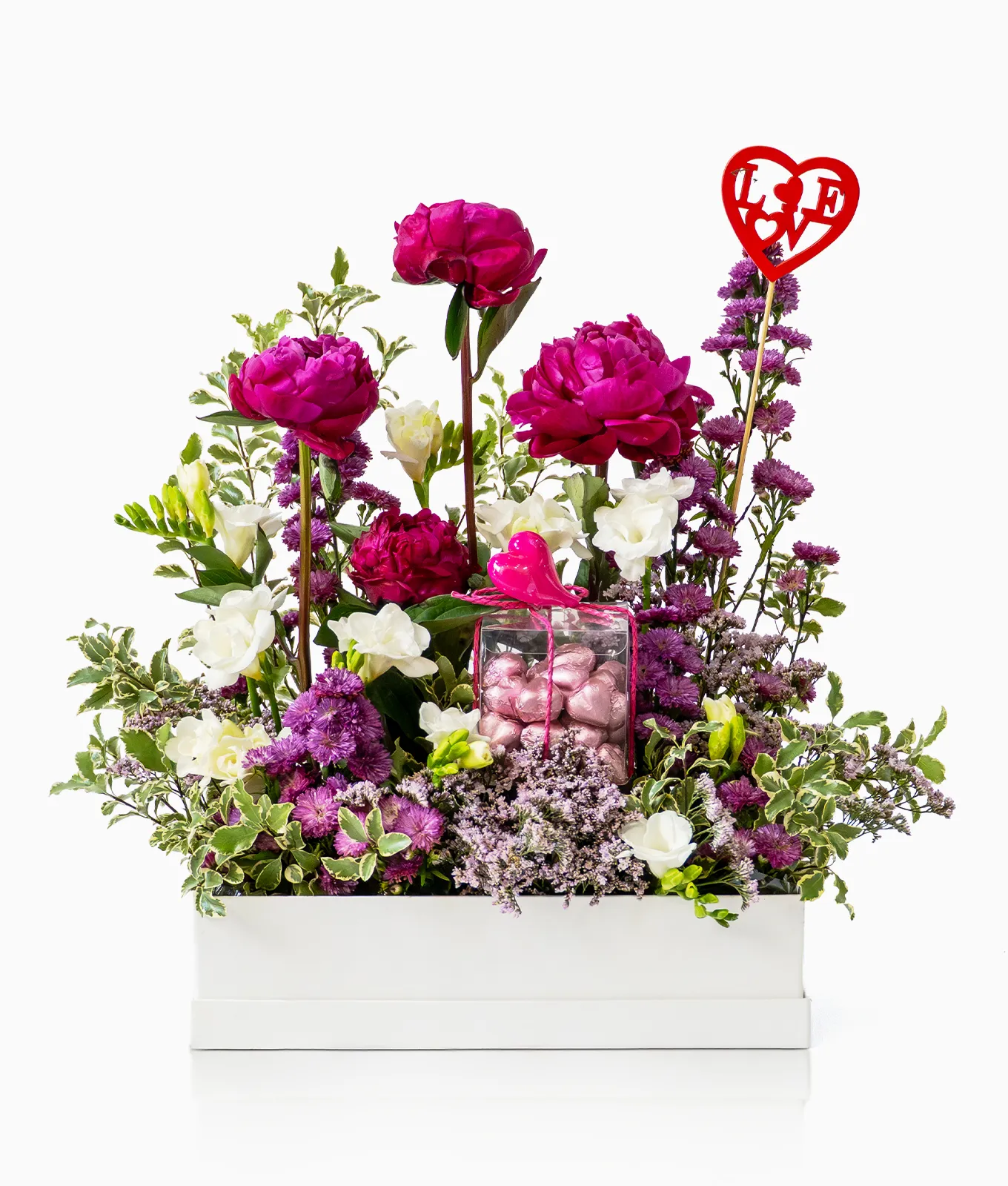 Presented in a sleek Alia Box, the blooms are artfully layered with Purple Aster, airy Purple Limonium, and lush Pittosporum greenery. This set is elevated by a generous 350g Chocolate Box and a romantic Love stick topper, making it an indulgent and complete gift for a truly special occasion.