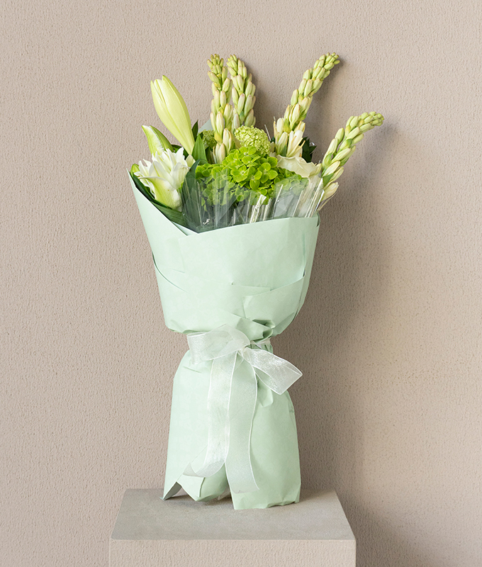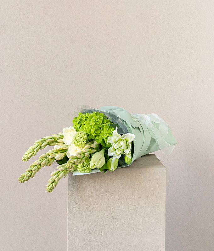 A bouquet mix of white and green florals wrapped in our green Alia Flowers wrapping paper and tied with white ribbon.