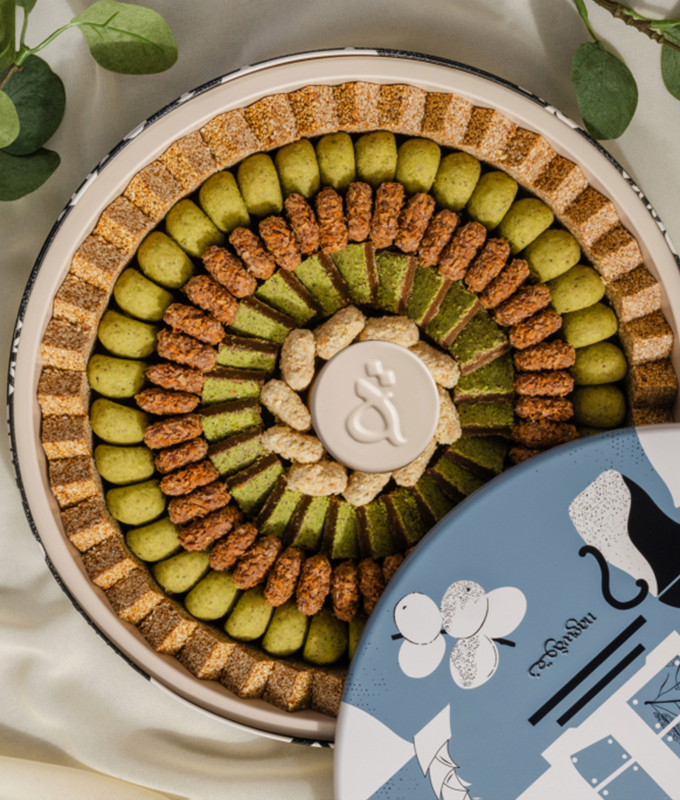 A delightful assortment of Rahash Wafers with almond and roasted coconut, rangina, ghraiba pistachio and simsimya.