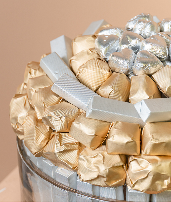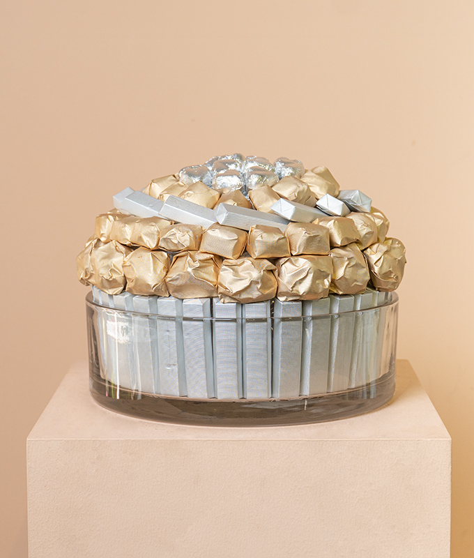 A Chocolate Arrangement done in a Glass vase using Kitkat, Plain heart milk chocolate, Burnt Hazelnut and Lion Bar Chocolate.