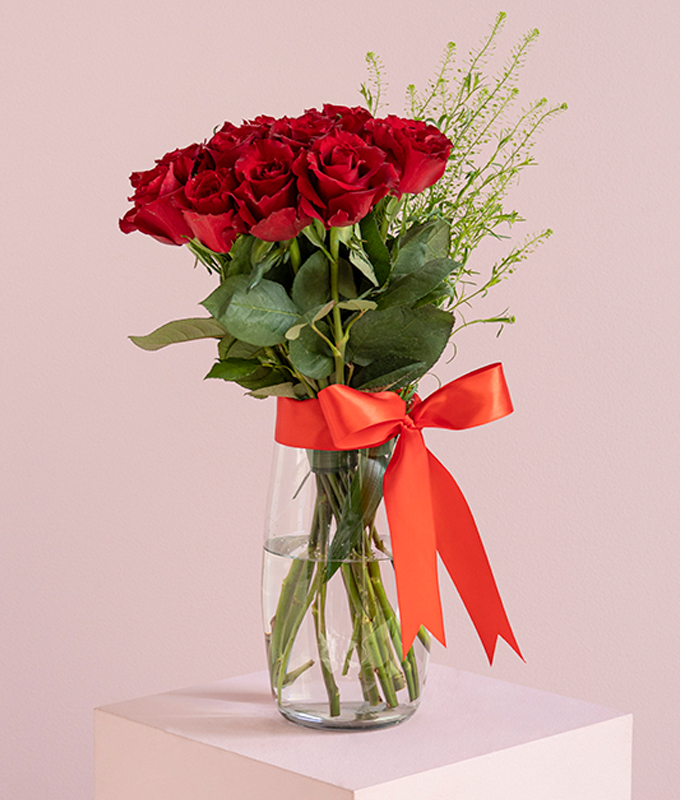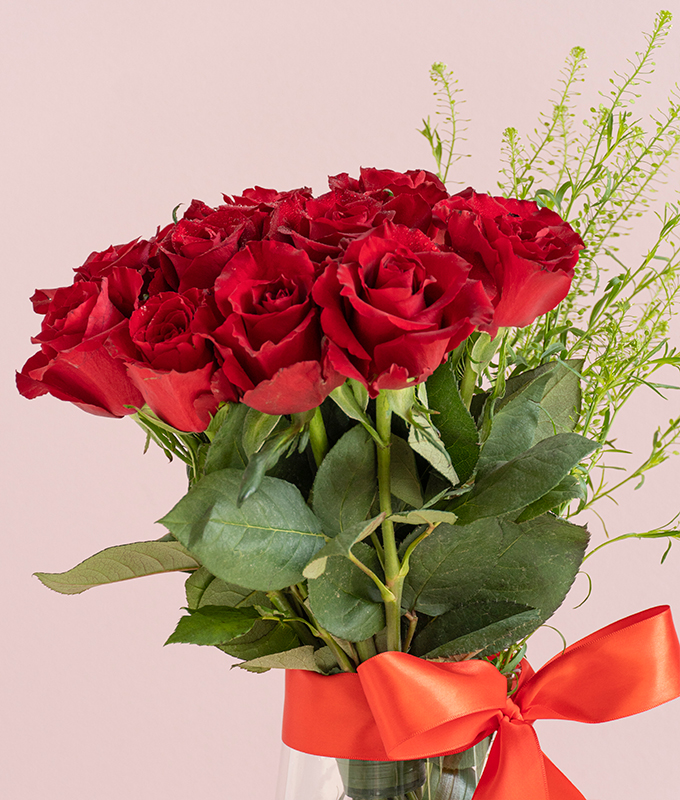 A classic arrangement of vibrant red roses paired with fresh greenery, beautifully displayed in a clear glass vase and accented with a striking red ribbon. Perfect for adding a touch of elegance to any celebration or heartfelt moment.