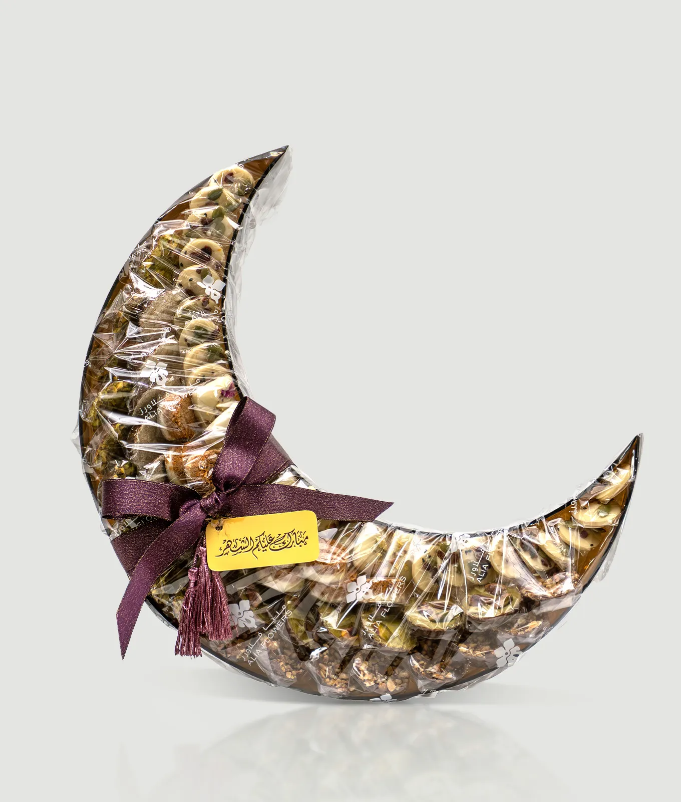 The arrangement features a meticulously layered dome of artisanal sweets, each individually wrapped to ensure peak freshness and hygiene. The shimmering metallic finish of the vessel, paired with a signature crescent moon charm and a luxury dark ribbon, makes this a standout piece for the Holy Month.