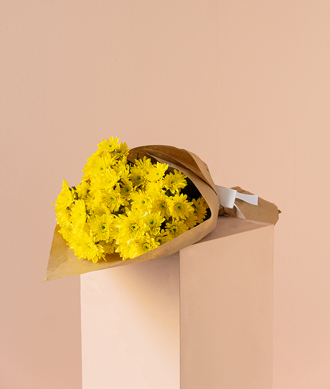 A vibrant bouquet of yellow chrysanthemums, hand-arranged to create a burst of sunshine and warmth. Wrapped in premium wrapping paper and finished with a ribbon, “Golden Radiance” brings a cheerful and uplifting touch to any occasion.