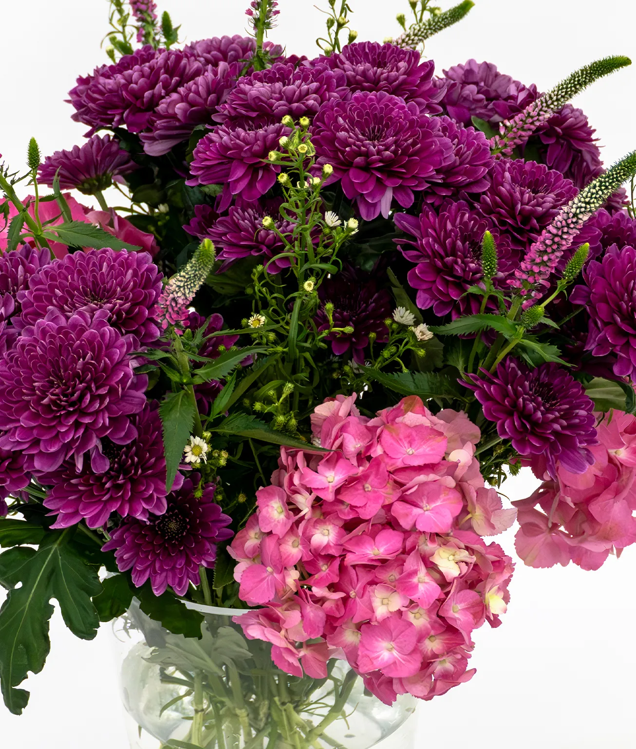 Lavender Love is a graceful flower arrangement of purple veronica, white asters, and pink hydrangea. Accented with dark purple chrysanthemum sprays, it conveys elegance, warmth, and heartfelt admiration. Carefully arranged in a glass vase, it radiates sophistication and charm. The mix of purples, soft pinks, and crisp whites creates a serene, uplifting ambiance. A perfect way to express love, appreciation, and tender affection for someone meaningful.