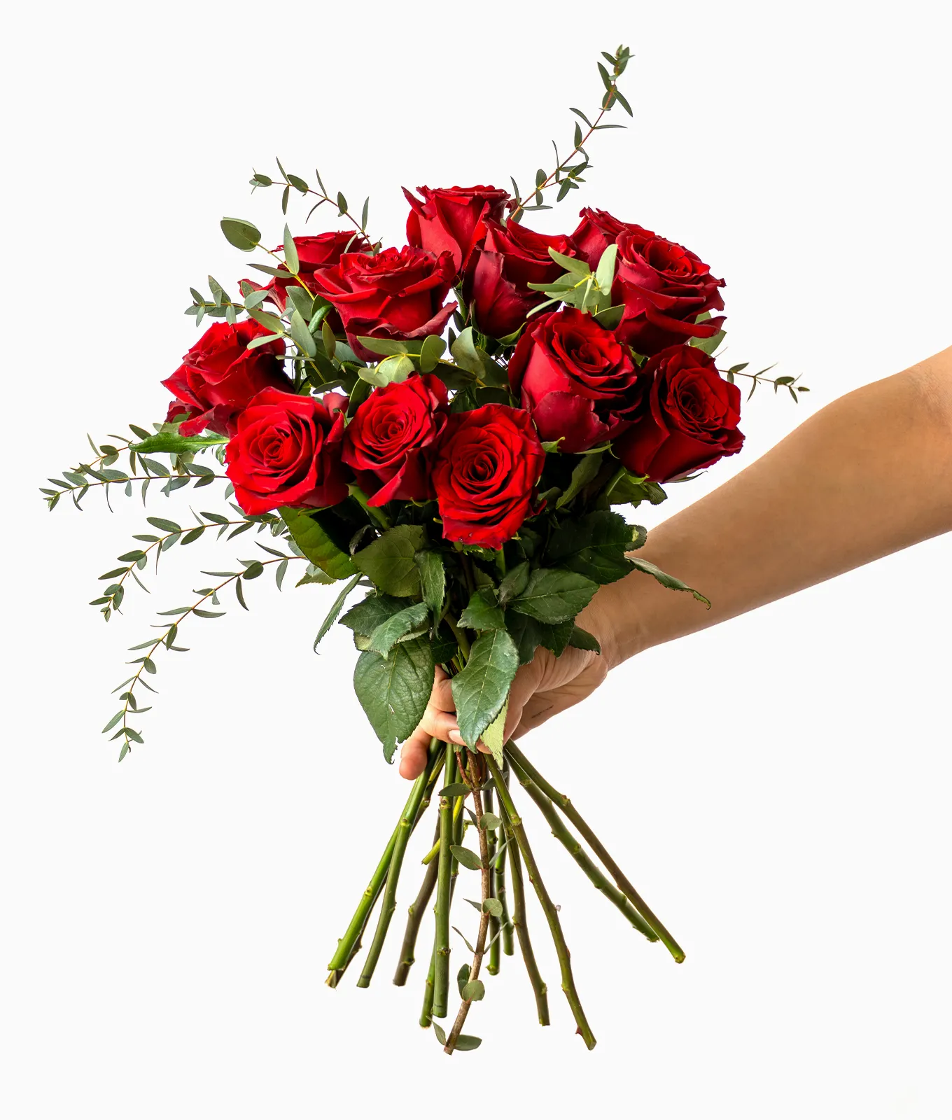 Accented with stems of fresh Eucalyptus, the design gains a natural, garden-inspired movement and a subtle, refreshing fragrance. It is a sophisticated and heartfelt choice for expressing pure, unwavering affection.