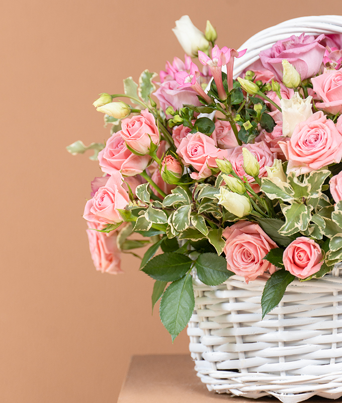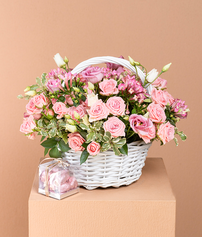 A sweet basket filled with soft pink roses, beautifully paired with a box of heart-shaped chocolates. A charming and thoughtful gift for someone special.