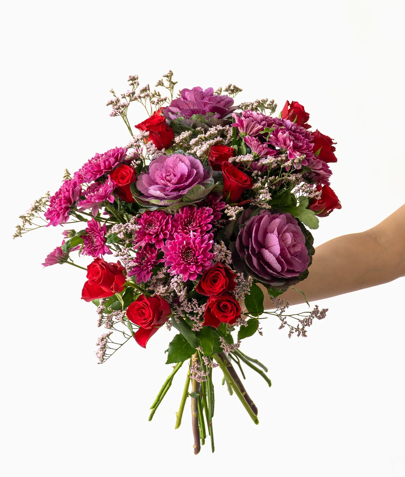 Rising Romance is a captivating hand-tied bouquet that blends deep, passionate tones with unique garden textures. This arrangement features Red Roses, beautifully contrasted by the architectural form of Purple Brassica.