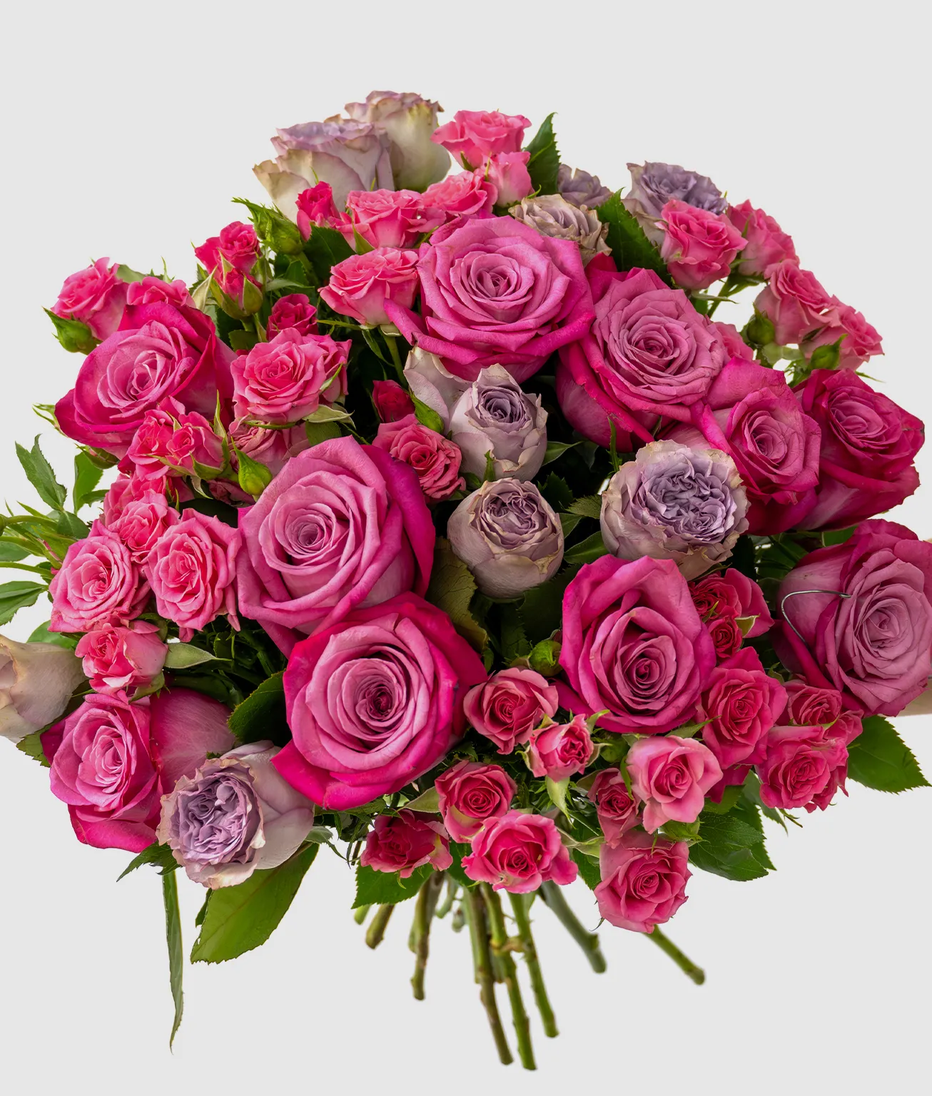 Rosy Dream is a stunning bouquet of purple roses and dark pink spray roses. Its vibrant hues exude elegance, charm, and heartfelt affection. Carefully arranged to highlight the contrasting colors, it radiates sophistication and natural beauty.