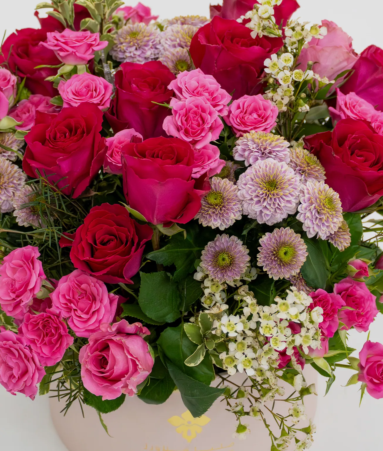 Rosy Tribute is a beautiful flower arrangement of pink and dark pink roses, complemented by pink spray roses. Accented with wax flowers, purple chrysanthemums, and lush pittosporum, it radiates warmth and affection. Carefully arranged in our signature Alia flowers box, it exudes elegance and charm. Its harmonious blend of soft pinks and purples creates a tender, uplifting presence. A heartfelt way to show someone they are cherished and truly special.