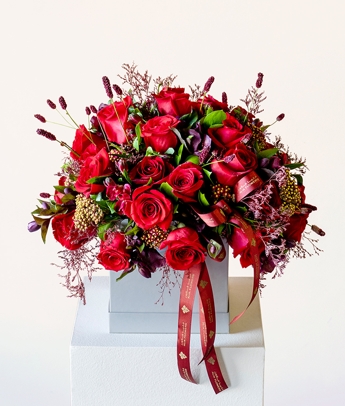 Rouge Majesty, a masterpiece of passion and elegance. This luxurious arrangement features an opulent display of rich red roses gracefully complemented by deep-toned fillers and textured botanicals. Nestled in a modern square box, the blooms create a striking blend of romance, sophistication, and depth. Accented with Alia Flowers’ signature ribbon, this design exudes timeless beauty—perfect for celebrating love, honoring special occasions, or gifting someone who deserves nothing less than extraordinary.