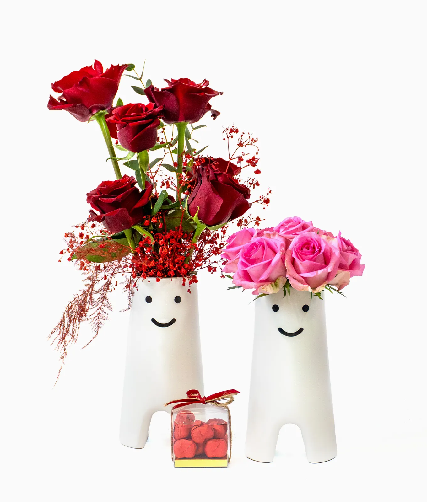 Smiling Duo brings a playful and charming energy to Valentine’s gifting with its unique twin-vessel design. This arrangement features a vibrant contrast between Red Roses and Pink Roses, each nestled in its own characterful white ceramic pot.