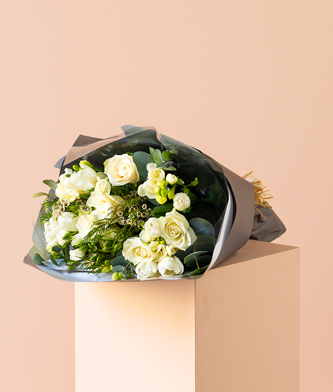 A graceful blend of white blooms, accented with fresh greenery. This bouquet exudes timeless elegance and embodies purity and tranquility in every bloom.