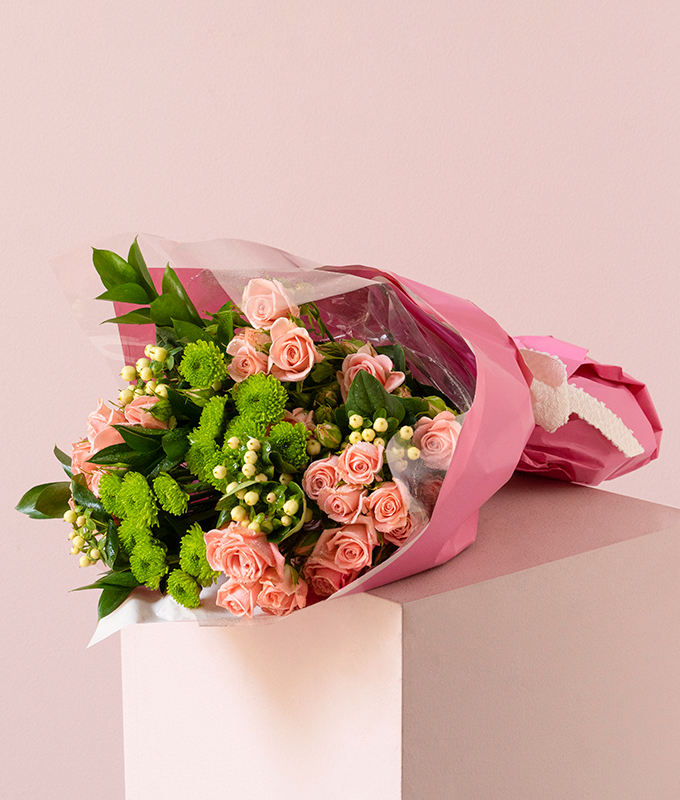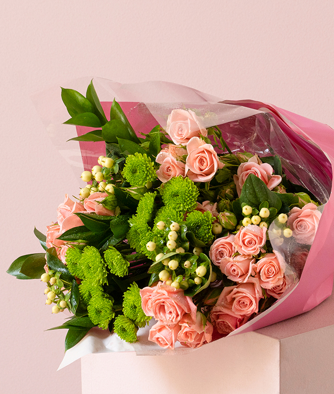 An enchanting blend of delicate pink spray roses and fresh green chrysanthemum buttons, thoughtfully wrapped in soft tones. “Spring Serenade” celebrates the beauty of nature with modern flair.