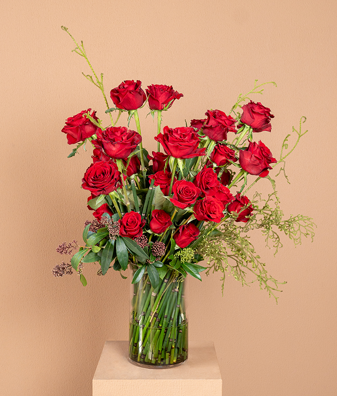 A stunning arrangement of 30 red roses arranged in a tall glass glass vase, complemented by lush greenery and delicate accents. It exudes sophistication and passion, making it the perfect statement of love for this Valentine.