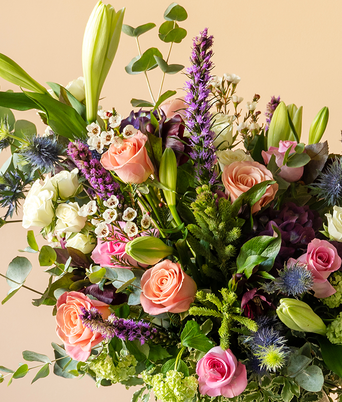 This arrangement features a mix of Rose, Eryngium, Spray rose, Single lilly, Liatris, Waxflower, Hydrangea, Viburnum, Eucalyptus, Pittosporum, Brunia
