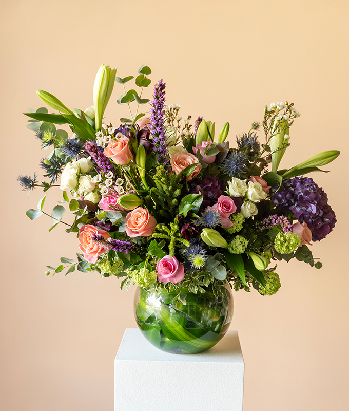 Velour Petals is a lavish composition that marries elegance with modern flair. At its heart, lush roses and delicate spray roses offer timeless romance, while a single lily lends a touch of graceful drama. Striking eryngium and brunia bring unique texture, contrasted beautifully with the soft abundance of hydrangea and the airy charm of waxflower. Tall liatris adds sculptural height, while viburnum, eucalyptus, and pittosporum weave in lush greenery for depth and balance.