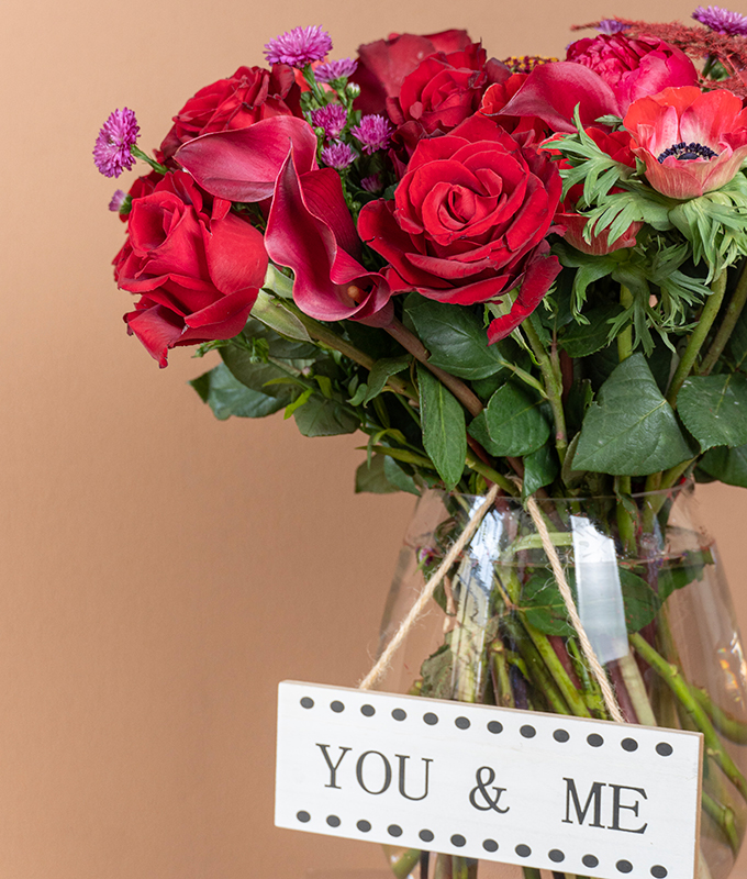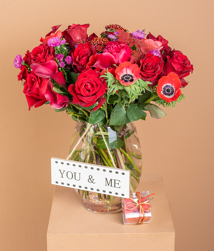 A romantic blend of red roses, anemones, and vibrant seasonal blooms arranged in a clear glass vase. Accompanied by a charming “You & Me” sign and a box of heart-shaped chocolates.